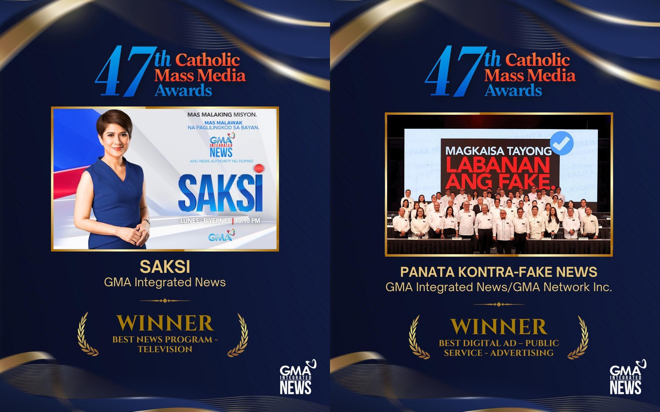 Late-night newscast Saksi was named as the Best News Program (Television), while GMA Integrated News' campaign, Panata Kontra-Fake News, was awarded Best Digital Ad - Public Service (Advertising).