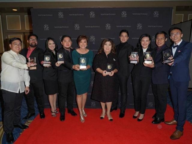 GMA gives the Philippines its biggest medal haul to date in New York Festivals. (From left to right) Mark Norella, executive producer for Reel Time: “Hawla” and “Gutom”; Neil Gumban, SAVP for Public Affairs; Regie Bautista, FVP for GMA Program Support Department and Corporate Strategic Planning; Ian Simbulan, executive producer for Reporter’s Notebook; Maki Pulido, host, Reporter’s Notebook; Jessica Soho, anchor, State of the Nation with Jessica Soho and host, Brigada; Alden Richards, lead actor, Alaala; Joy Madrigal, program manager, Alaala and Brigada; Raffy Tima, reporter, Brigada; Justin Baluyot, researcher for Reel Time: “Gutom”. (Photo courtesy of Steven Lam)