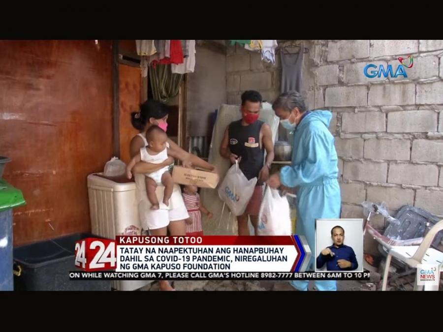 Bilang tulong at pagpupugay sa mga tatay na tulad niya ngayong Father's Day, nagbigay ang GMA Kapuso Foundation ng Kapuso GCQ family pack na may frozen chicken packs, biskwit, tinapay, hotdog, bigas, juice, de lata, sabong panligo at panlaba.