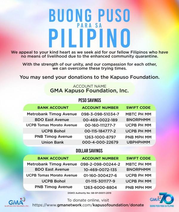 In line with GMA's 70th anniversary slogan “Buong Puso para sa Pilipino,” the Kapuso Network is appealing to donors who are willing to give aid to their fellow Filipinos in need during this 30-day quarantine.