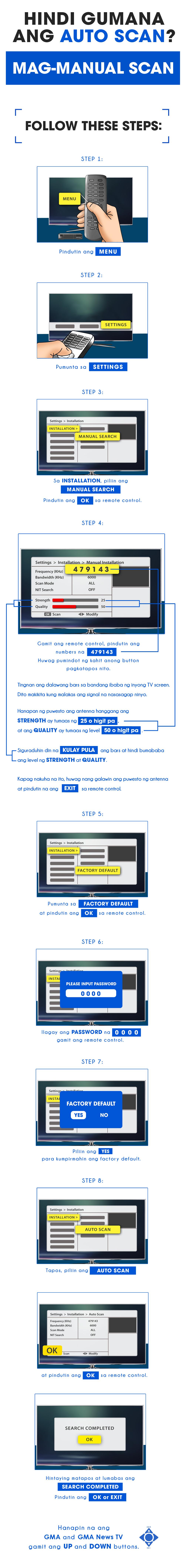 GMA Network advises viewers in areas where AUTO SCAN failed, to do a MANUAL RESCAN of their digital TV box.