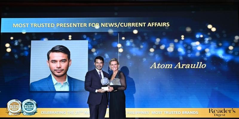 Atom Araullo won “Most Trusted TV News Presenter” at the 2023 Reader's Digest Trusted Brand Awards.