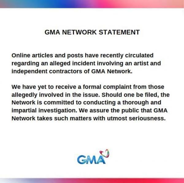 GMA Network Statement on the alleged incident involving an artist and independent contractors of GMA Network