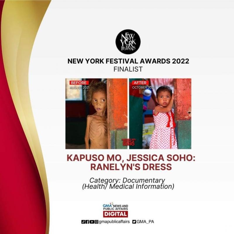 2021 finalist Kapuso Mo, Jessica Soho (KMJS) returns to the NYF stage after its segment “Bestida ni Ranelyn (Ranelyn's Dress)” was nominated this year in the Documentary: Health/Medical Information category. The story featured six-year-old girl Ranelyn who longed to wear her favorite dress after being reduced to literally skin and bones due to poverty and severe malnourishment. Hosted by GMA News and Public Affairs pillar Jessica Soho, KMJS remains the most-watched public affairs program on Philippine TV and the most followed Philippine TV program on Facebook.