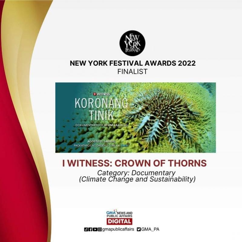 Long-running public affairs program I-Witness gets not just one but two nominations this year. Sandra Aguinaldo's documentary “Virus Hunters” is gunning for a win under the Documentary: Science & Technology category, while “Koronang Tinik (Crown of Thorns)” by Atom Araullo makes it to the finalist spot in the Documentary: Climate Change & Sustainability category. Sandra's documentary featured a group of experts' ongoing study of bats and the diseases that humans can get from them. On the other hand, Atom's story investigated the sudden increase in dap-ag or crown of thorns in the waters of Jose Panganiban in Camarines Norte.