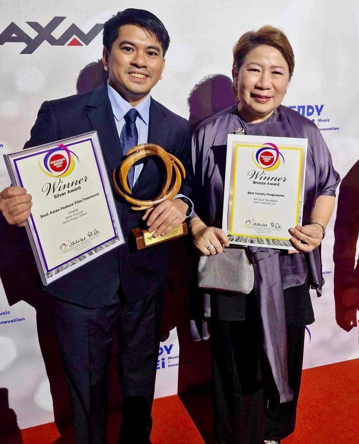 GMA Network Senior Vice President for Entertainment Group, Lilybeth G. Reasonable and GMA Public Affairs Senior Program Manager and Creative Producer of “Firefly” Kristian Julao proudly accepted the awards on behalf of GMA Network.