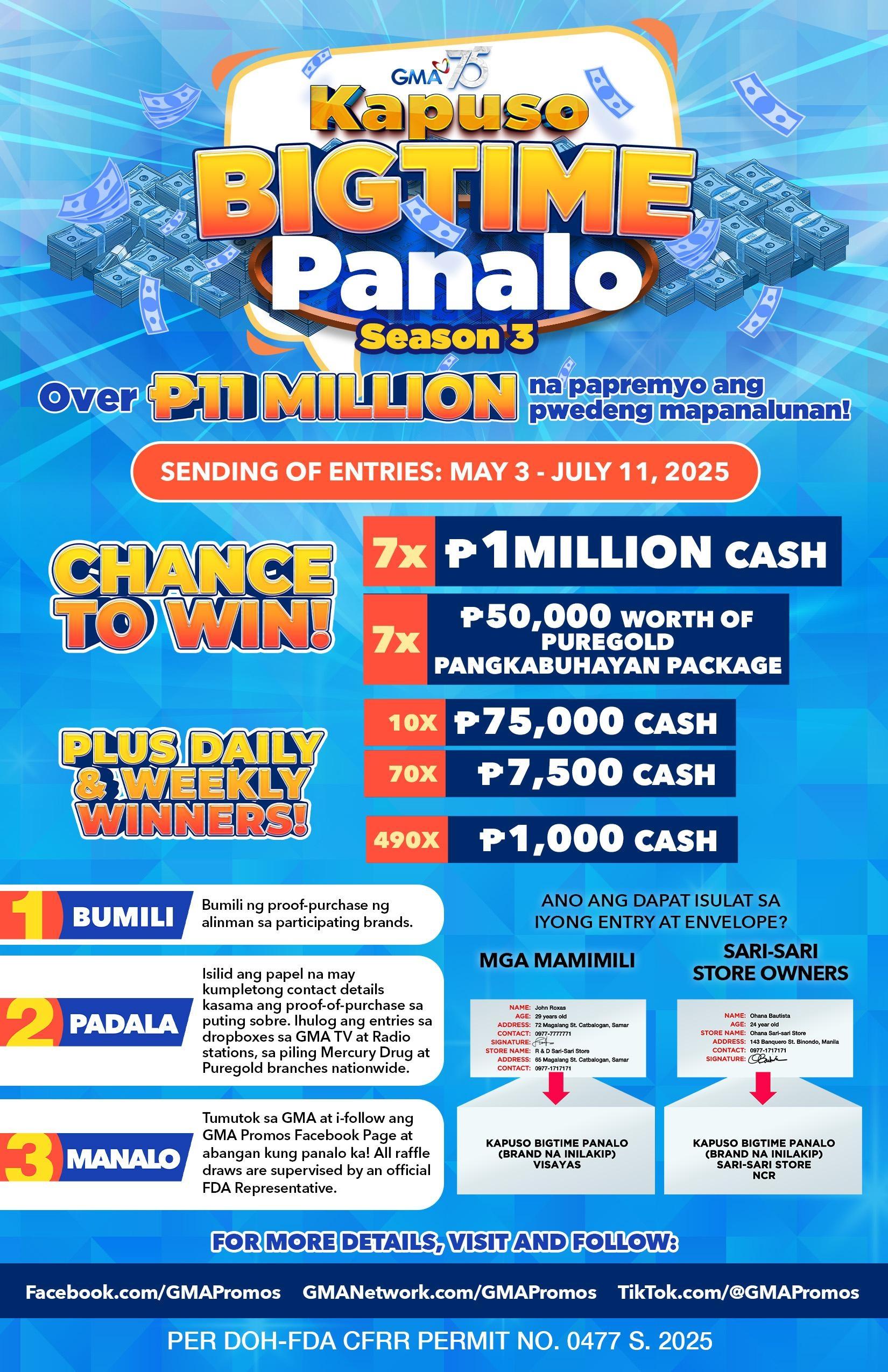 Kapuso Bigtime Panalo 3 runs from May 3 to July 11, 2025, giving participants plenty of chances to take home big-time prizes in celebration of GMA Network's milestone anniversary.
