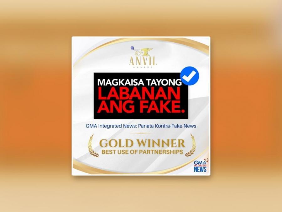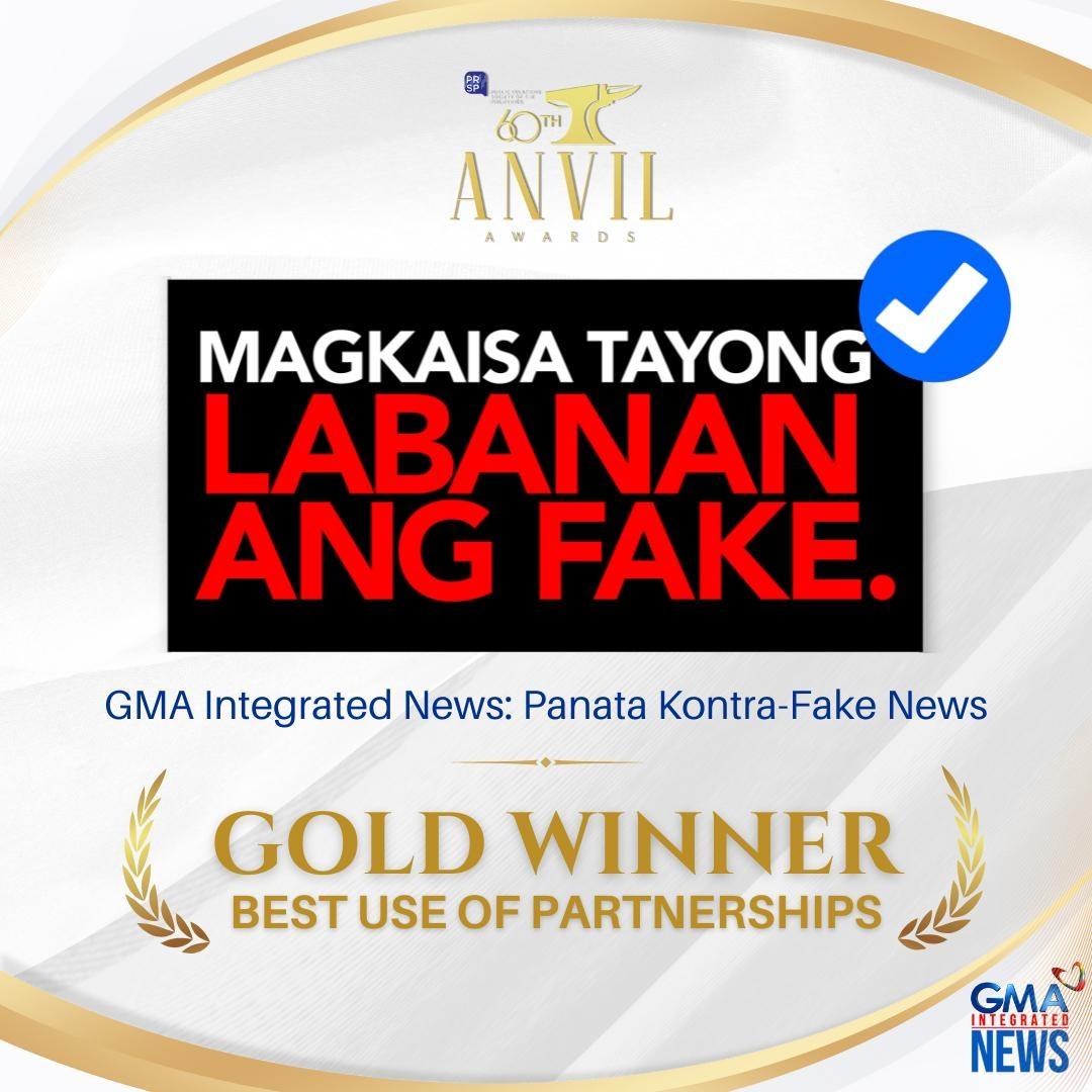 GMA Network's groundbreaking advocacy, Panata Kontra-Fake News, won Gold in the Best Use of Partnerships category at the 60th Anvil Awards held on January 28 at the Manila Hotel. Receiving the award was Oliver Victor B. Amoroso, Senior Vice President and Head of GMA Integrated News, GMA Regional TV, and Synergy.