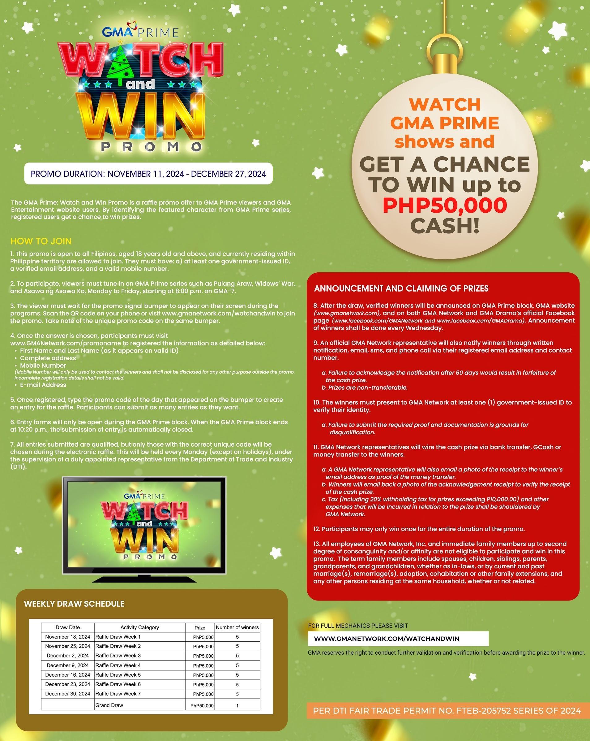 The GMA Prime: Watch and Win Promo runs from November 11, 2024, until December 27, 2024. For the full contest mechanics, visit www.GMANetwork.com/watchandwin. Per DTI Fair Trade Permit No. FTEB-205752 Series of 2024.