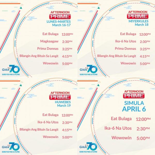 "The Network has also advised its block timers and co-producers to comply with the community quarantine guidelines. GMA will continue to air fresh, pre-taped episodes of some shows and thereafter, a new programming line-up is in store for all Kapuso viewers in the coming days."