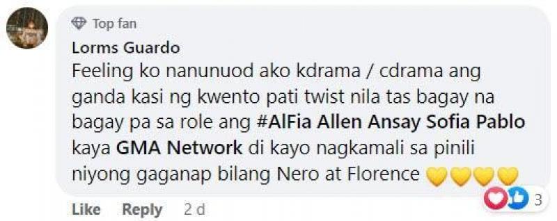 “Feeling ko nanonood ako K-Drama o C-Drama ang ganda kasi ng kuwento pati twist nila tapos bagay na bagay pa sa role ang #AlFia Allen Ansay at Sofia Pablo kaya GMA Network di kayo nagkamali sa pinili niyong gaganap bilang Nero at Florence,” mensahe naman ng isang netizen.