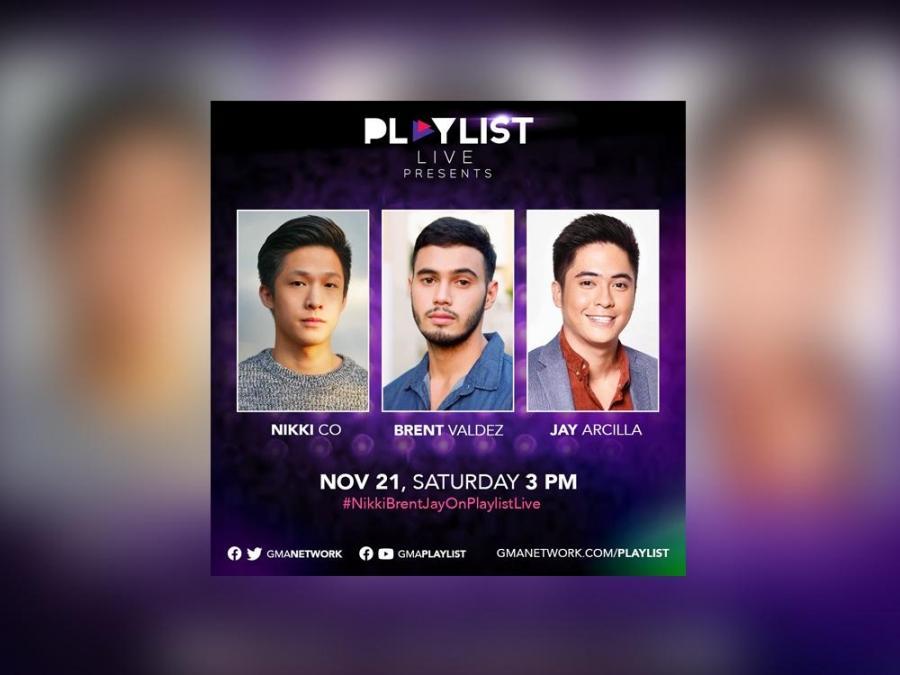 Spend your weekend right with a special treat from Kapuso actor-singers Nikki Co, Brent Valdez, and Jay Arcilla as the three fill the GMA Playlist Live with kilig this Saturday, November 21, at 3:00 P.M.