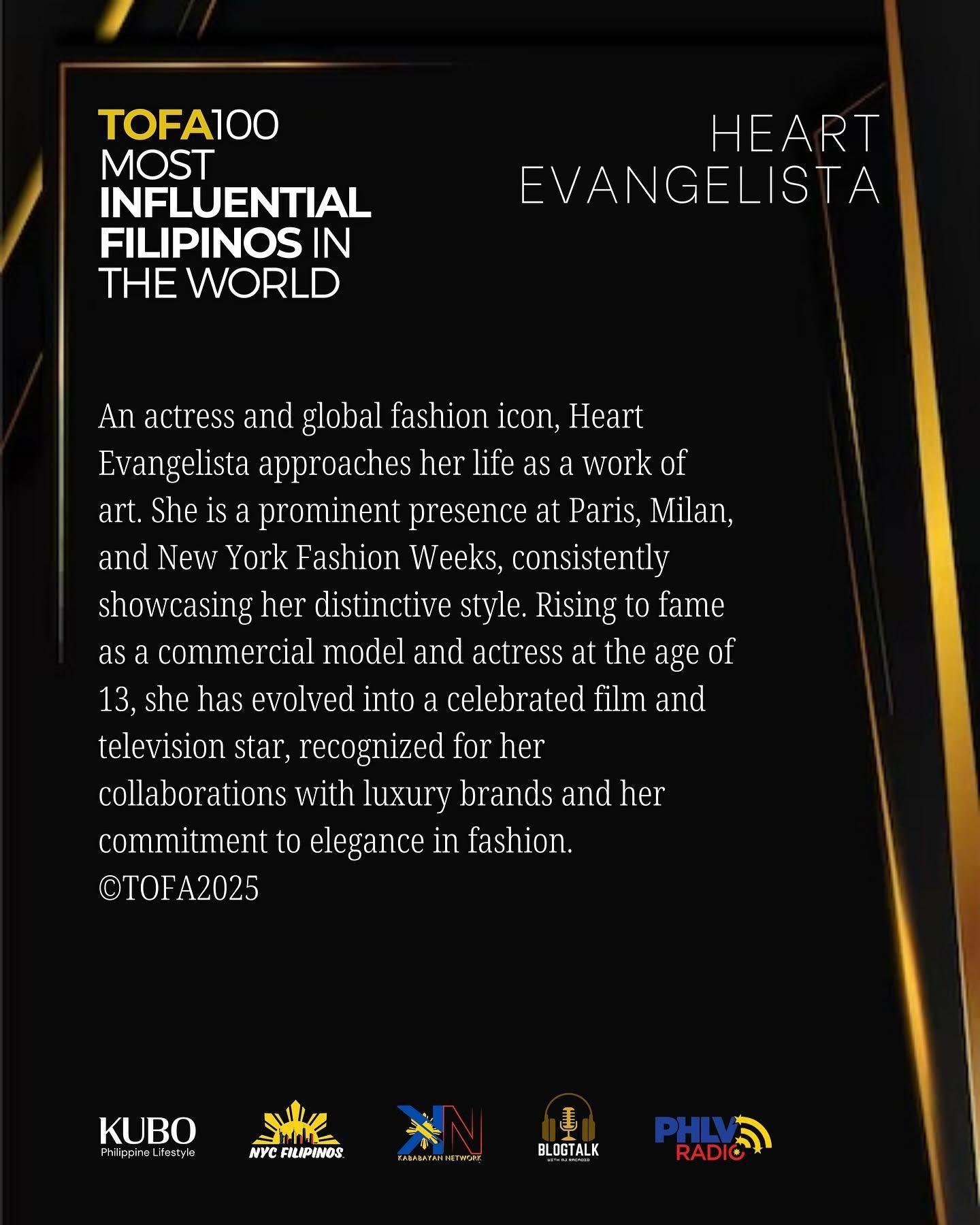 Heart is named one of the most influential Filipinos worldwide for her prominent presence in Fashion Week events in Paris, Milan, and New York while showcasing her distinctive style, generating a promising media impact value.