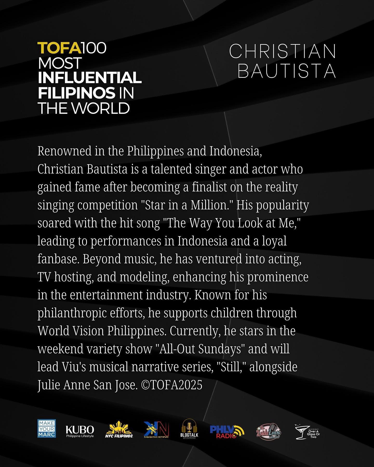 Global Icon Heart Evangelista and Asia's Romantic Balladeer Christian Bautista are included in the 100 Most Influential Filipinos in the world by The Outstanding Filipinos in America (TOFA).