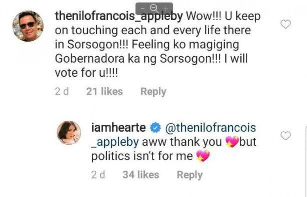 Heart simply replied, “@thenilofrancois_appleby aww thank you but politics isn't for me.”