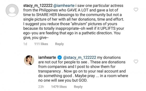 The netizen wrote, “@iamheartee, I saw one particular actress from the Philippines who gave a lot of time to share her blessings to the community but not a single picture of her with all her donations, time and effort.