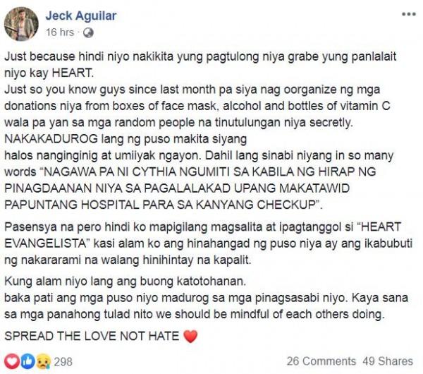 Ayon kay Jeck, hindi kailangang magbitaw ng masasakit na salita dahil lamang sa hindi nakikita ng mga tao ang pagtulong ni Heart.