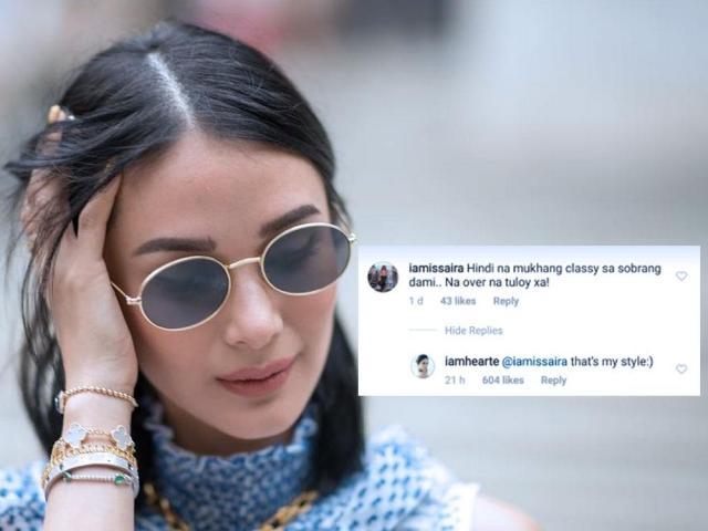 Kapuso fashionista Heart Evangelista defended herself after a netizen bashed her about wearing too much jewelry.