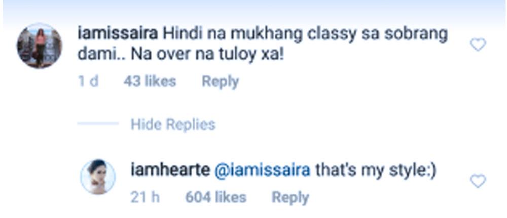 A netizen with Instagram handle @iamissaira commented on her photo saying, “Hindi na mukhang classy sa sobrang dami. Na over na tuloy siya.”
