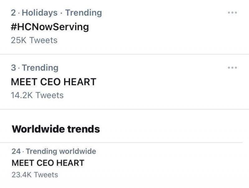 Ang official hashtag ng first episode nito na “#HCNowServing,” kasabay ng “Meet CEO Heart,” ay kinuha ang top spots sa Philippine Twitter at nag-land pa sa Top 25 ng Worldwide Twitter Trends.