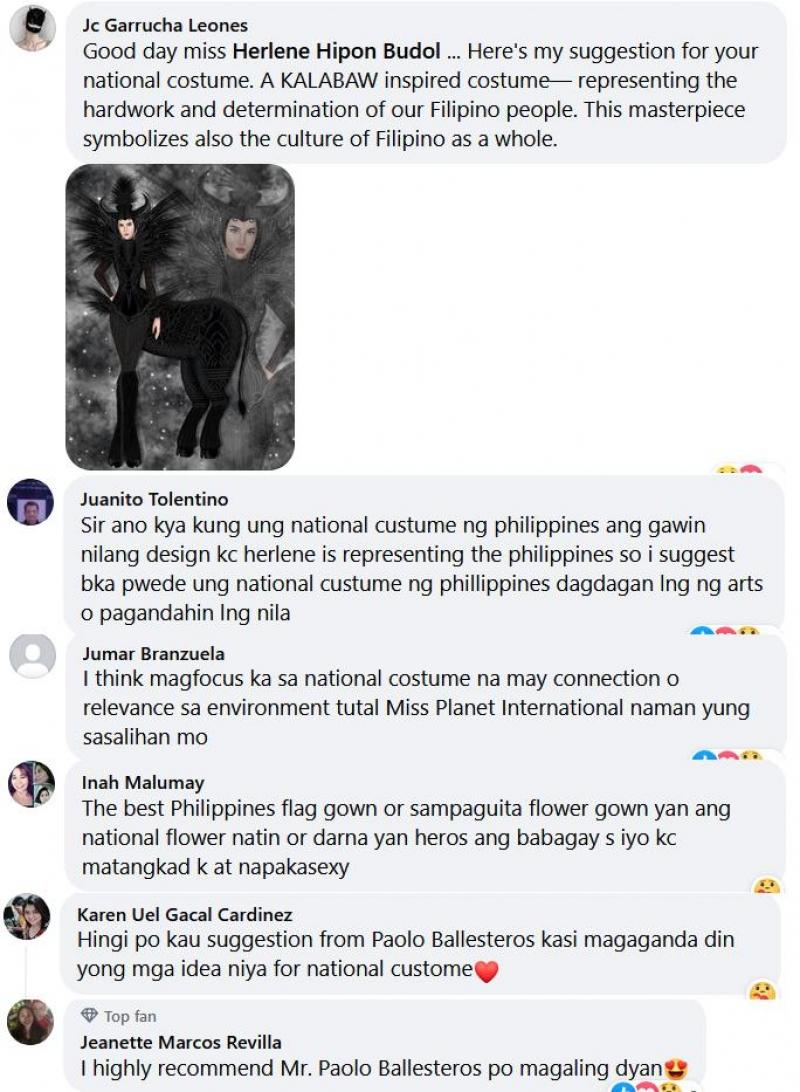 Another user, meanwhile, suggested for Herlene to wear a national costume inspired by the environment, while another one commented that she should wear a gown inspired by the sampaguita, the Philippines' national flower. They also further suggested wearing something Darna-inspired as she is a well-known Filipino comics superhero.