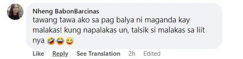 Reaksyon ng viewer na may pangalang Nheng BabonBarcinas, "tawang tawa ako sa pag balya ni maganda kay malakas! kung napalakas un, talsik si malakas sa liit nya."