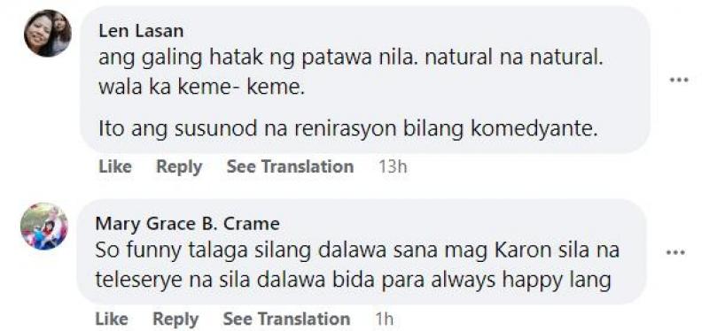 "So funny talaga silang dalawa sana magkaroon sila na teleserye na sila dalawa bida para always happy lang," pagpuri nin Mary Grace B. Crame sa dalawang aktor.