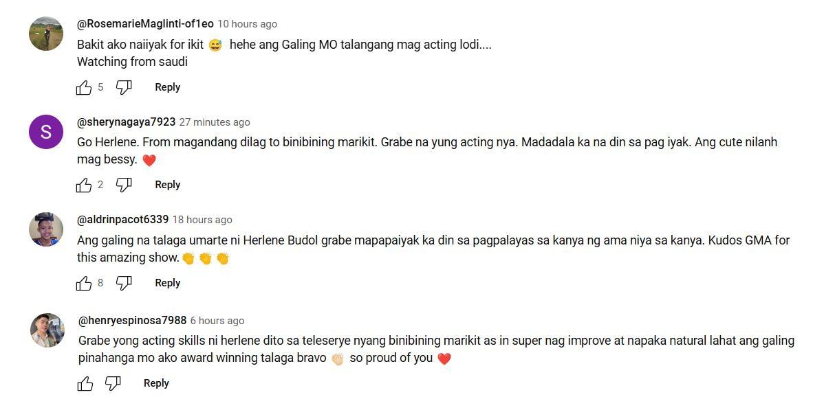 Sabi sa comment, "Grabe yong acting skills ni herlene dito sa teleserye nyang binibining marikit as in super nag improve at napaka natural lahat ang galing pinahanga mo ako award winning talaga bravo. So proud of you."