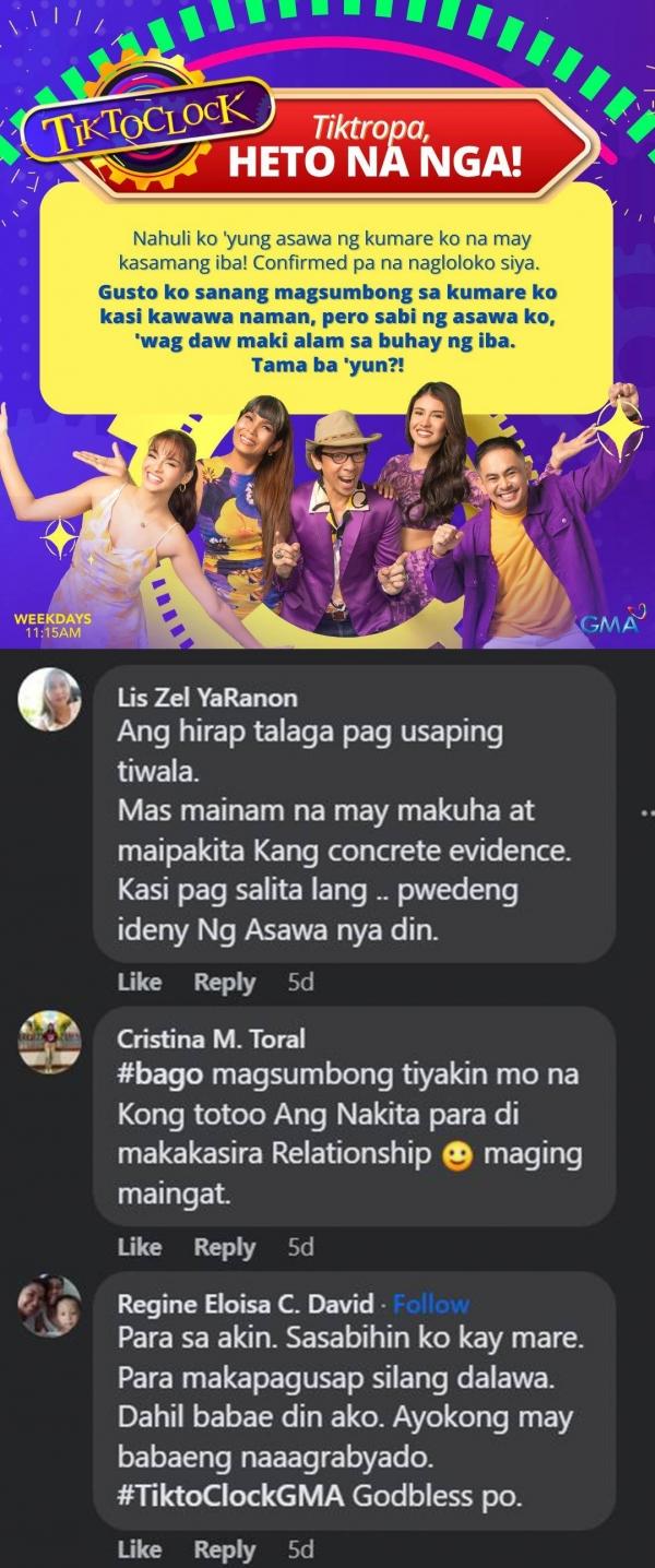 Isa sa kanilang mga napag-usapan ay kung dapat bang iniimbitahan ang mga toxic family members sa mga party. Nagbigay rin ng opinyon ang TiktoClock hosts kung dapat bang sabihin sa kumare na nagloloko ang asawa nito.