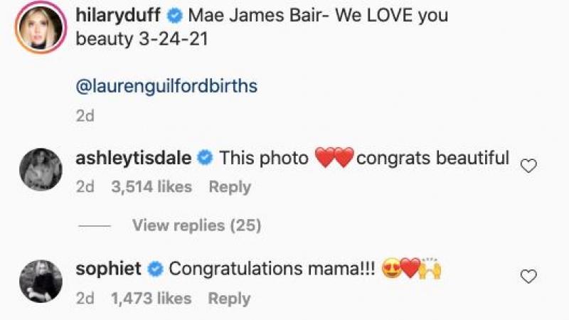 Several celebrity friends congratulated Hilary on welcoming her third child, including fellow new mom Sophie Turner and former Disney star Ashely Tisdale, who gave birth to her first child, Jupiter Iris French, just a day before Hilary welcomed her new baby.