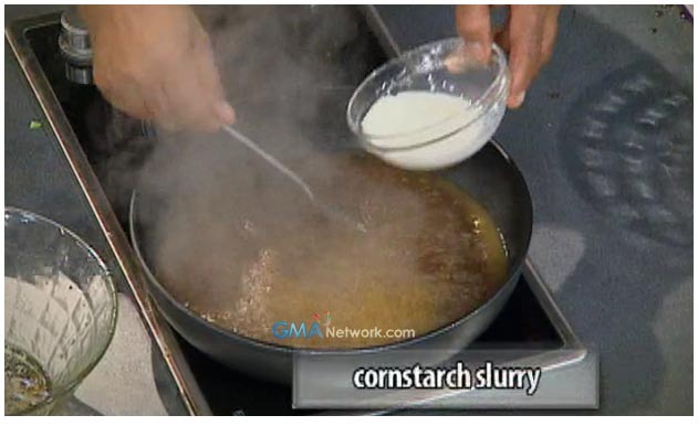 4. In a separate pan, get two cups of itik stock. Let it simmer and add the cornstarch-water mixture.
