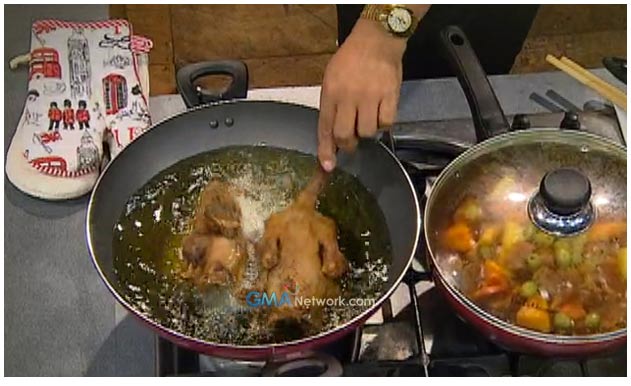 3. Preheat deep-frying pan. Deep-fry itik until golden brown. Drain and set aside.