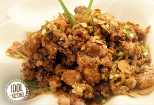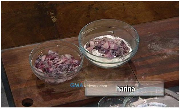 1. Dredge squid on flour. Deep-fry in oil until crisp. Drain and set aside.