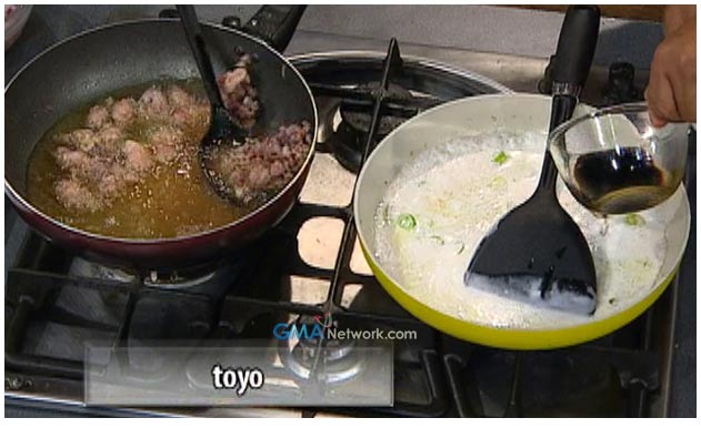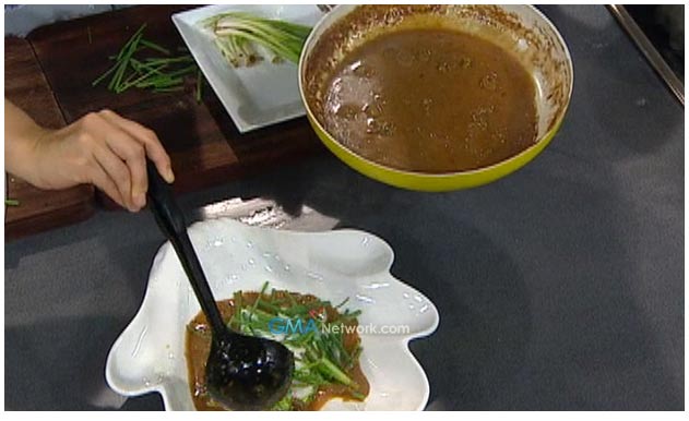 2. In a saucepan, sauté oil, garlic and squid ink. Add small amount of water, soy sauce, and vinegar. Let it simmer until vinegar cooks.
