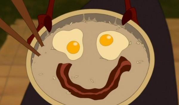 In the training camp, Mushu tries to get Mulan ready for the day by waking her up and feeding her a breakfast of congee topped with eggs and bacon.