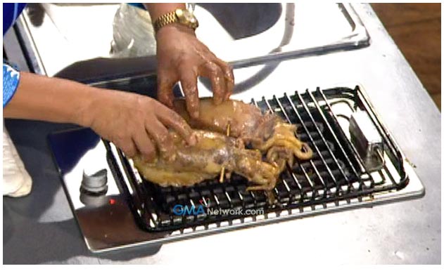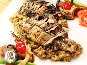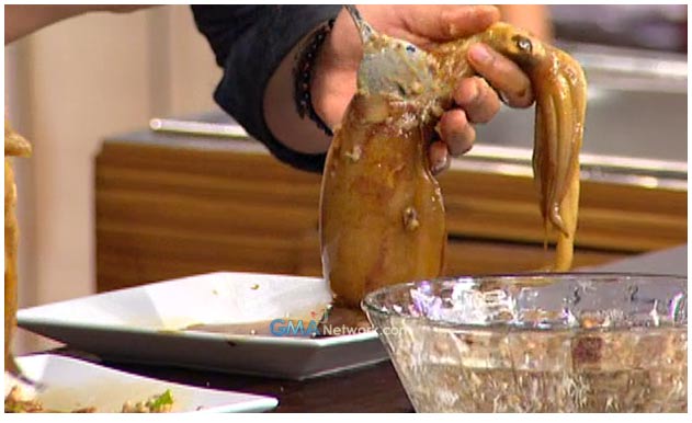 7. Remove squid from the marinade. Stuff squid with sisig and secure head and body of the squid using toothpicks.