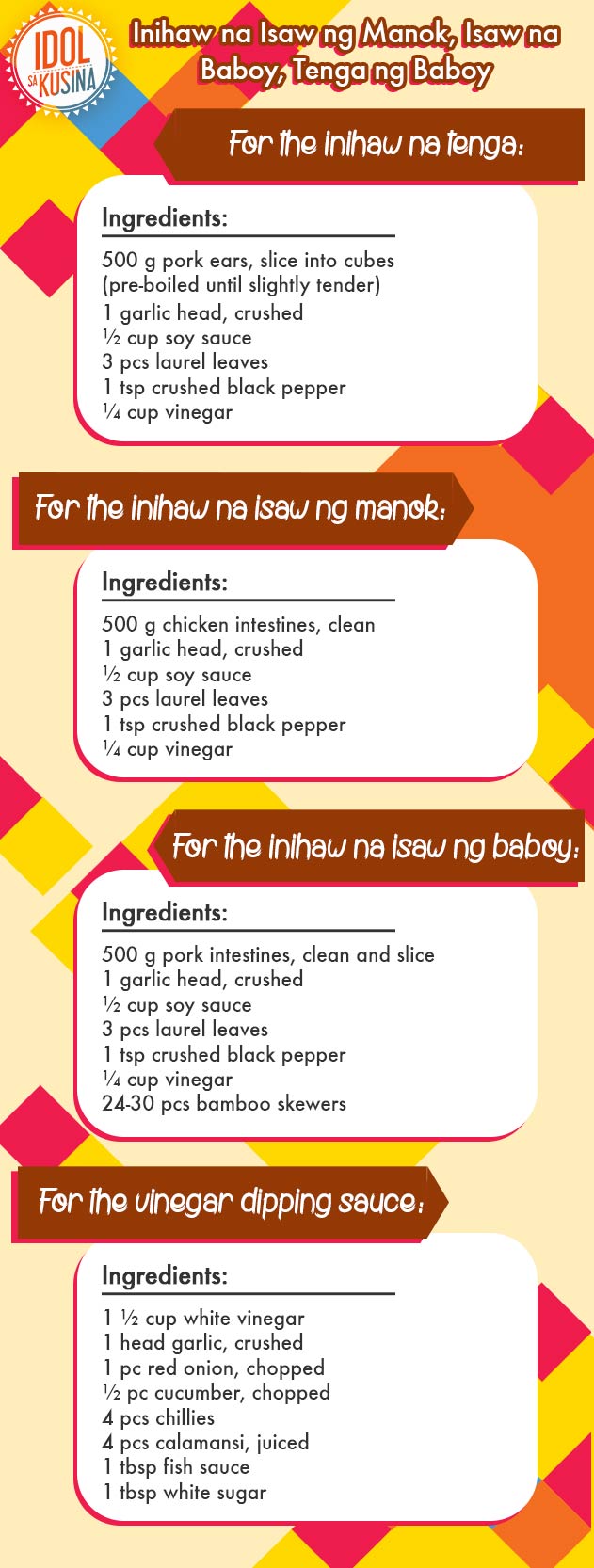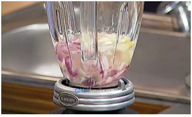 4. For the vinegar dipping pad, combine red onion, garlic, chillies and blend in a food processor or blender. Put it in a serving dish and add vinegar and calamansi. Season with salt, sugar and pepper. Serve as a dipping sauce on inihaw na chicken isaw, pork isaw and pork ears with chopped cucumber on the side.