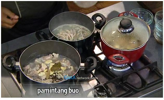 1. In a pan, add garlic, soy sauce, laurel leaf, crushed black pepper to the chicken intestines. Let it boil. When the mixture boils, add vinegar and reduce the heat to low. Allow to simmer then stir and turn the fire off.