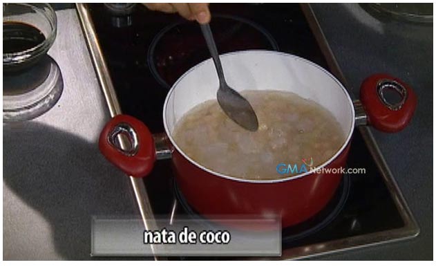 1. In a sauce pan, boil nata de coco and tapioca in sugar and water. When it boils, allow to simmer until cooked and reduced the syrup.