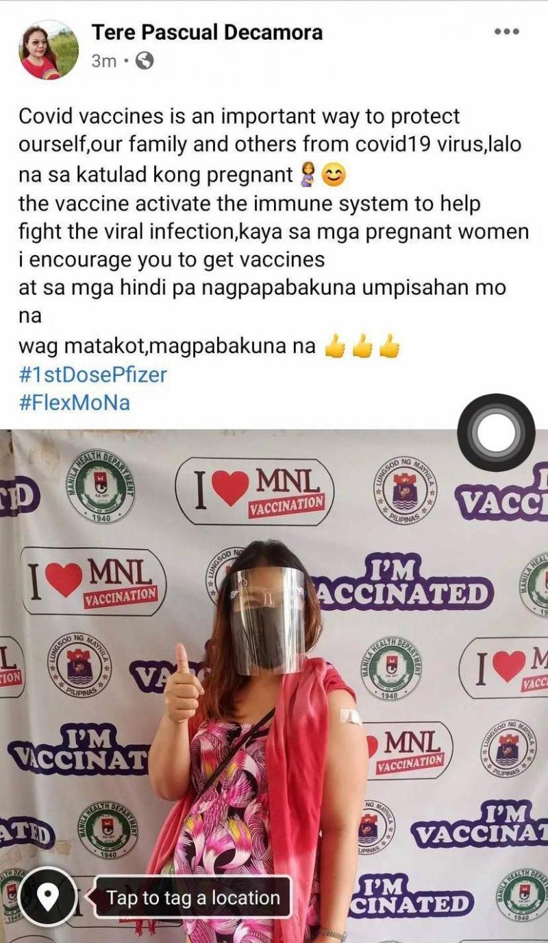 Para kay Tere Pascual Decamora, importante ang vaccine lalo na sa mga buntis na katulad niya. Saad ni Tere, "COVID vaccine is an important way to protect ourself, our family, and others."