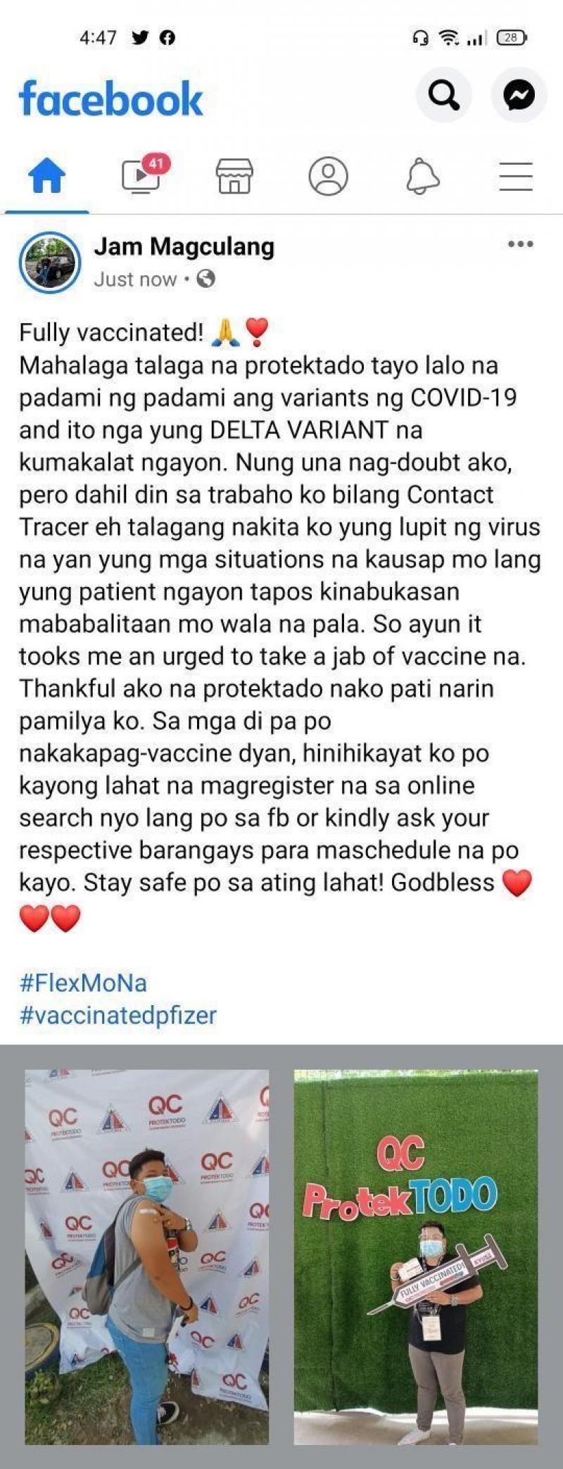 Ayon sa post ng isang contact tracer na si Jam Magculang, inamin niyang ang pagdududa niya noon sa vaccine ay nawala nang makita niya ang epekto nito sa mga taong kaniyang nakakausap.