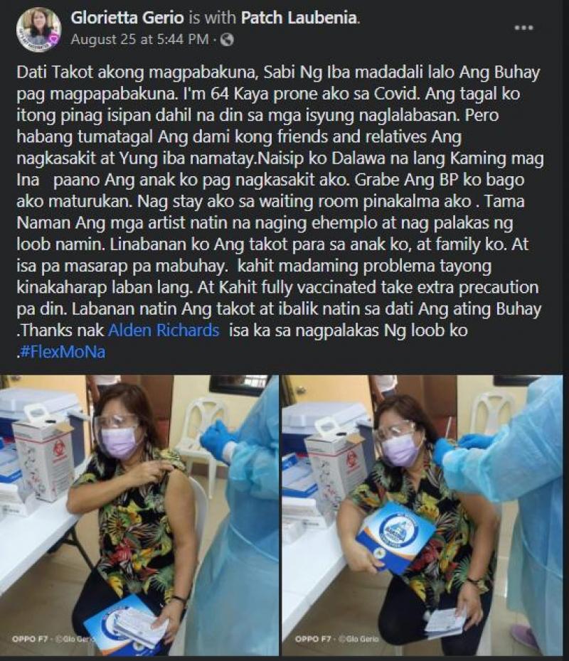 "Labanan natin ang takot at ibalik natin sa dati ang ating buhay. Thanks, nak Alden Richards, isa ka sa nagpalakas ng loob ko. #FlexMoNa"