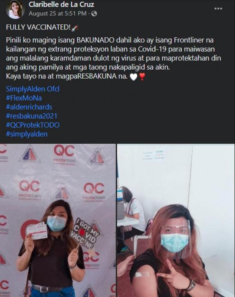"Mahalaga talaga na protektado tayo...Noong una nag-doubt ako, pero dahil din sa trabaho ko bilang contact tracer talagang nakita ko 'yung lipit ng virus na 'yan. 'Yung mga situations na kausap mo lang 'yung patient ngayon tapos kinabukasan mababalitaan mo wala na pala."