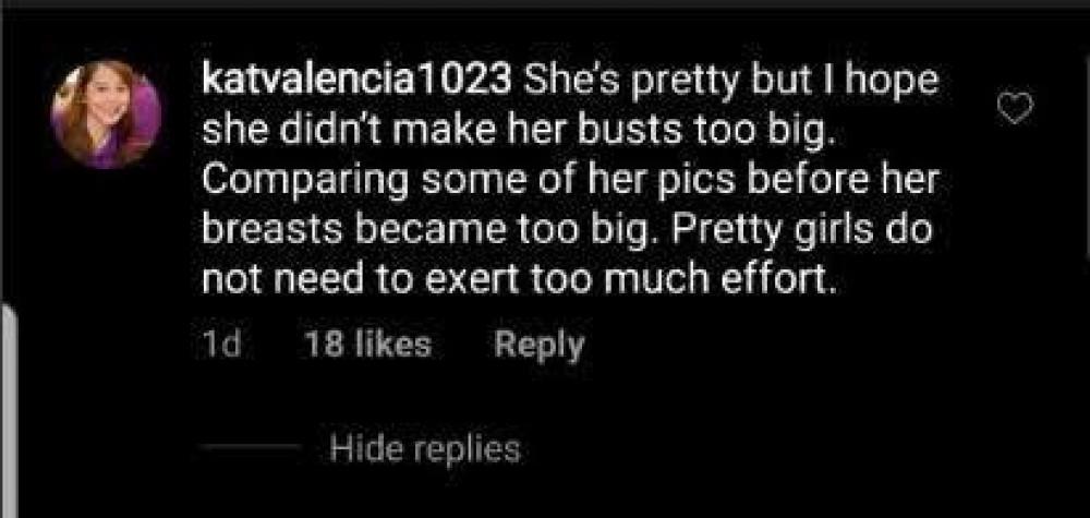 The celebrity mom called out the post of netizen @katvalencia1023 insinuating that Erika is purposely making her breasts too big.