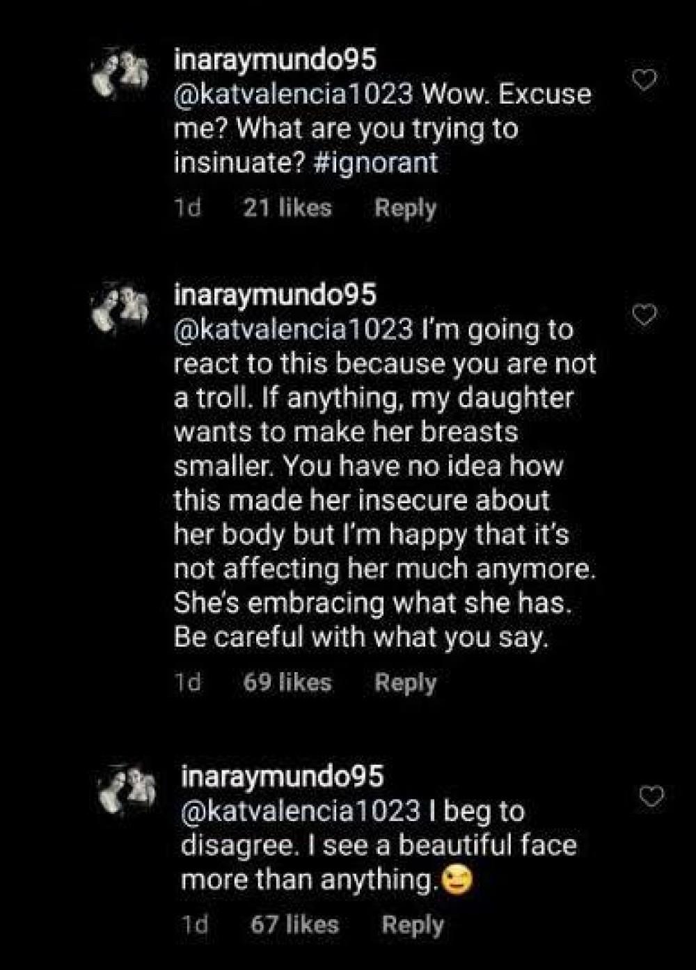 Sexy actress Ina Raymundo lashed out at a netizen who gave negative comments about the body of her daughter, Erika Rae Poturnak, on Instagram.
