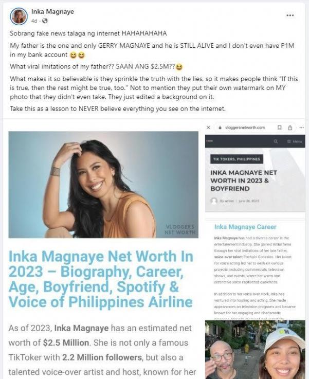 Inka took to Facebook to correct certain details about her posted on a website called “vloggersnetworth.com.”