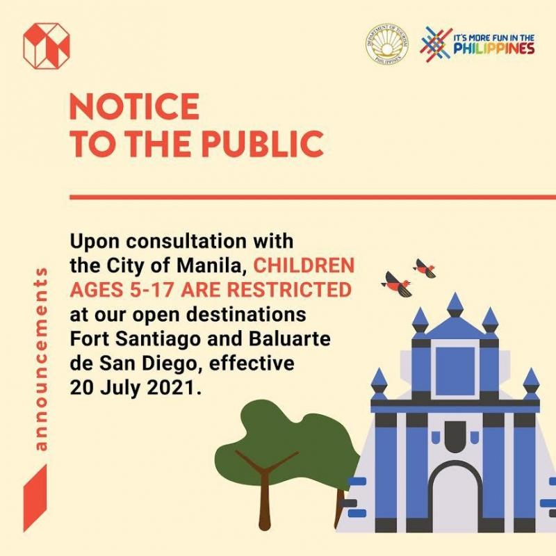 The Intramuros Administration has barred children ages five to 17 from visiting Fort Santiago and Baluarte de San Diego effective yesterday, July 20.