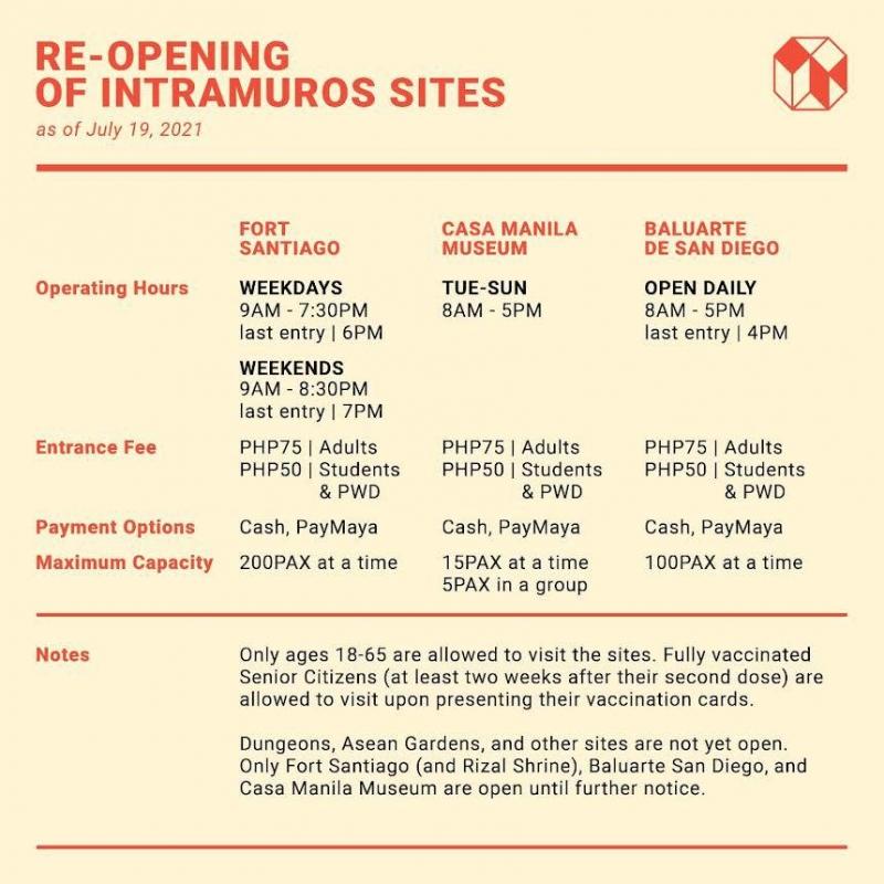 “Only ages 18-65 are allowed to visit the sites. Fully vaccinated senior citizens (at least two weeks after their second dose) are allowed to visit upon presenting their vaccination cards,” the Department of Tourism's (DOT) Intramuros Administration (IA) posted on social media.