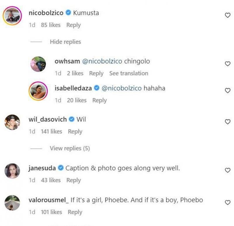The husband of host-actress Solenn Heussaff, Nico Bolzico, replied to Belle's post and suggested to name her baby “Kumusta”, while vlogger Wil Dasovich advised the Semblat couple to name it after him.