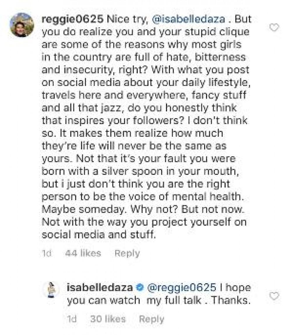 But one netizen @reggie0625 commented on Isabelle’s post saying that the “It Girl” is not suited to be the voice of mental illness.